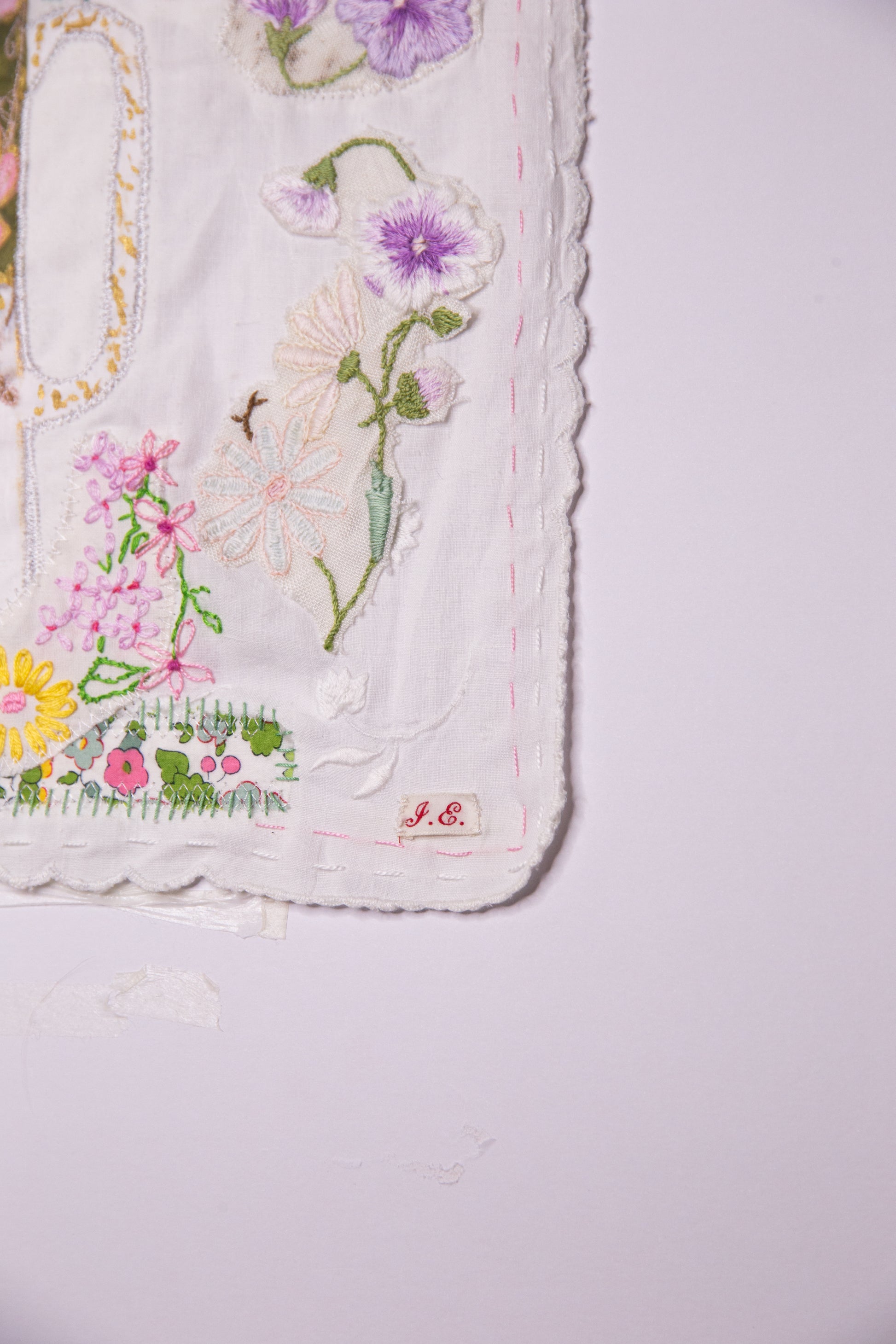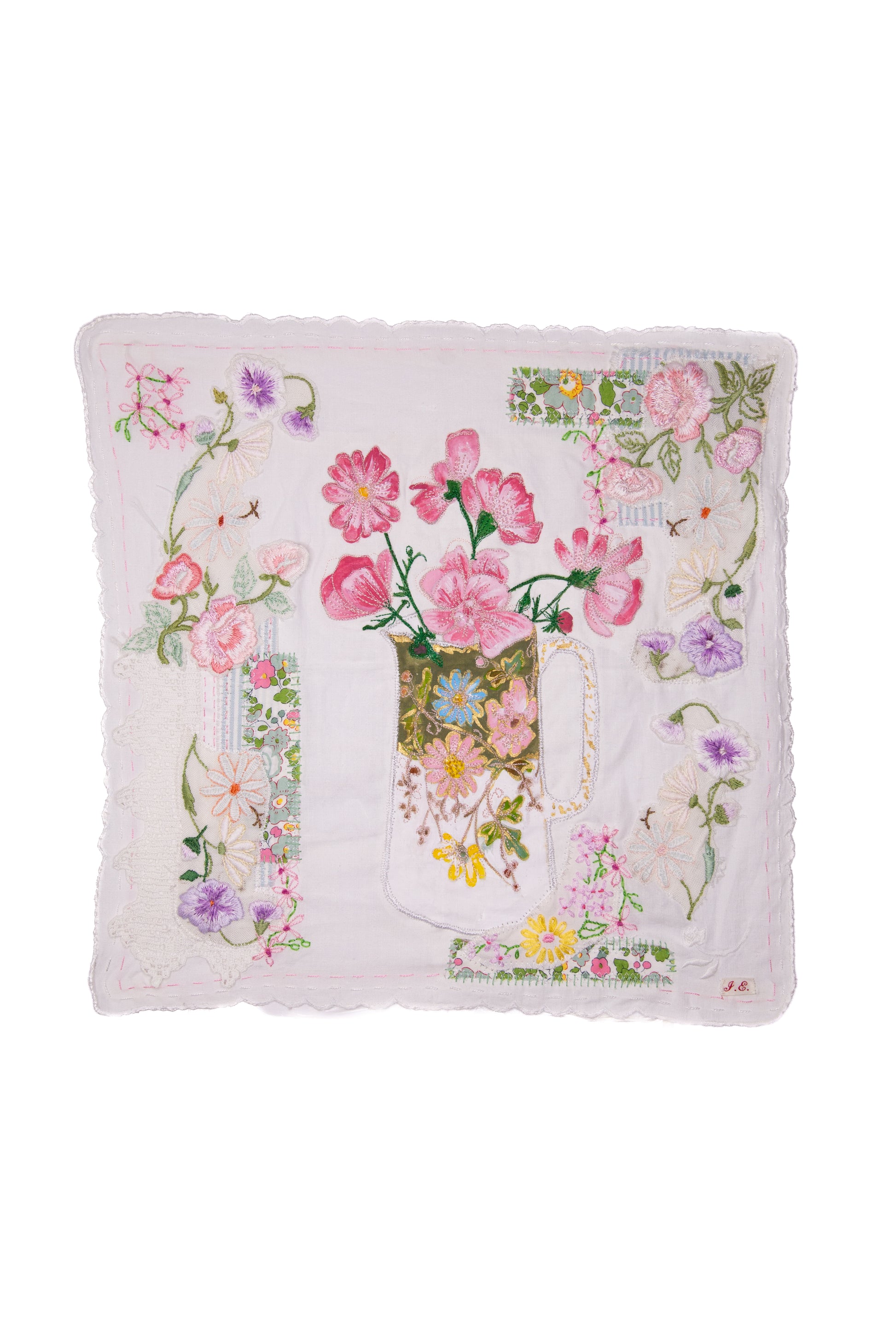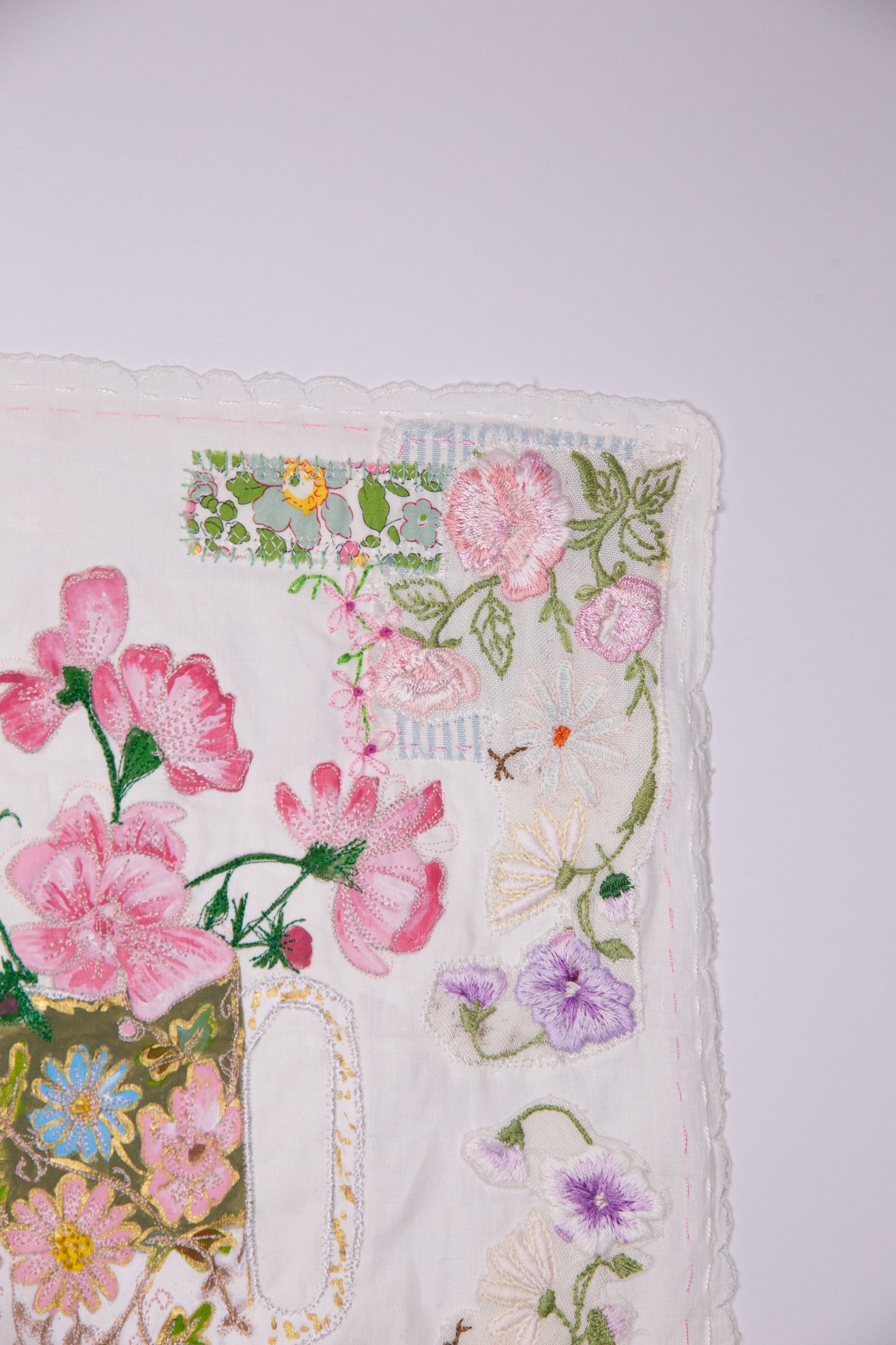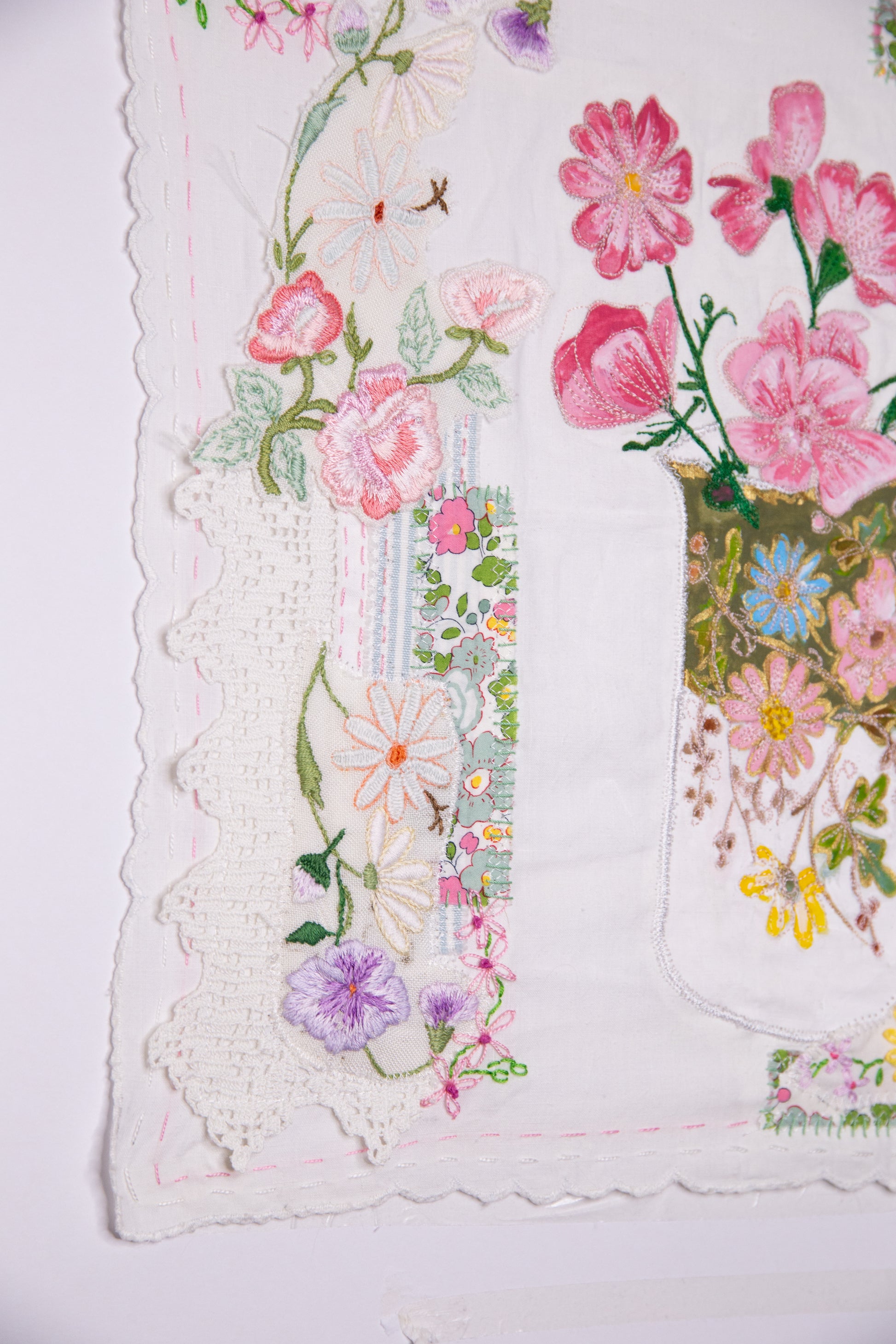 This piece combines modern and traditional textile techniques to evoke the delicate beauty of floral motifs inspired by antique china. Layers of painted fabric, intricate stitching, and appliqué create a richly textured surface