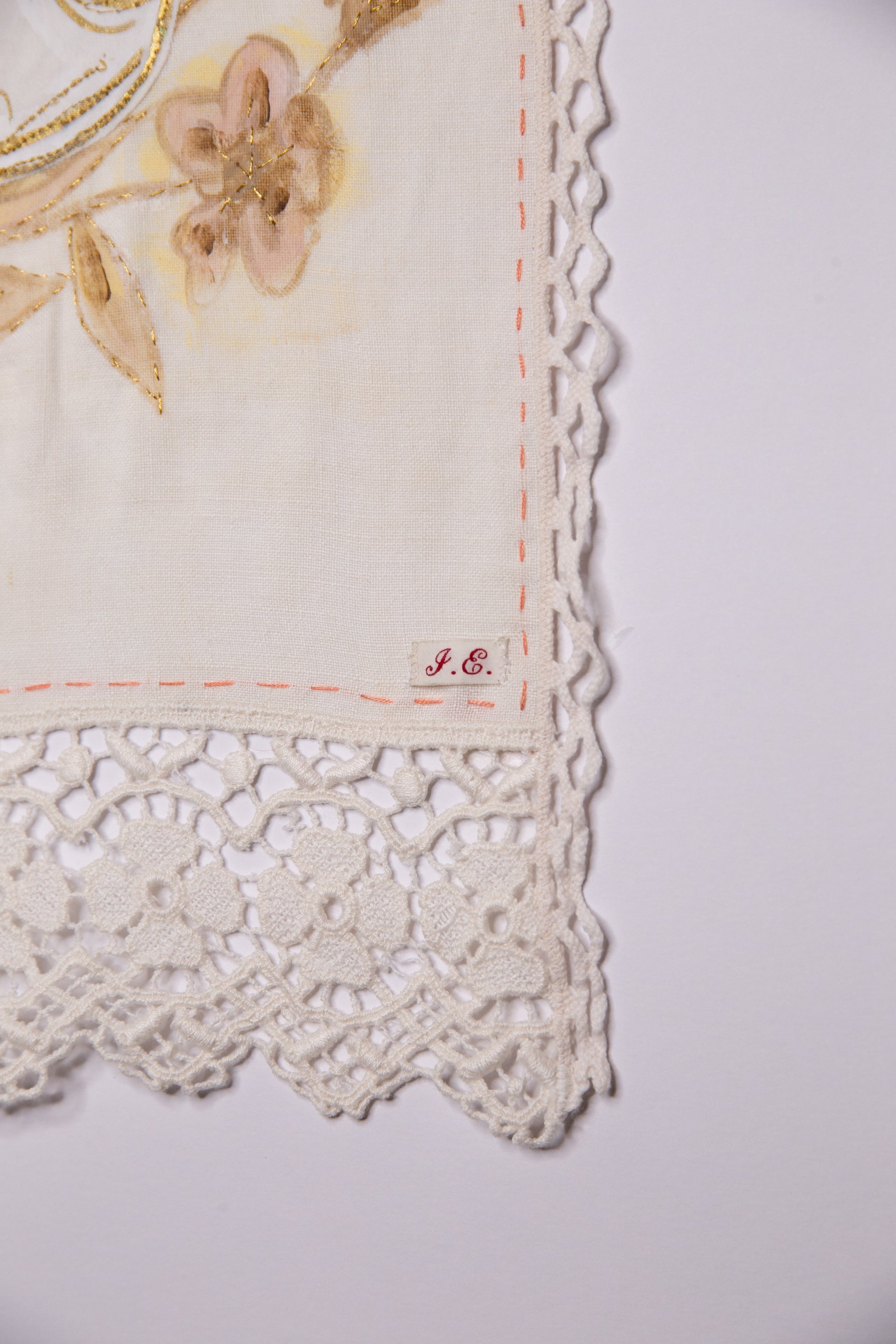 This piece combines modern and traditional textile techniques to evoke the delicate beauty of floral motifs inspired by antique china. Layers of painted fabric, intricate stitching, and appliqué create a richly textured surface