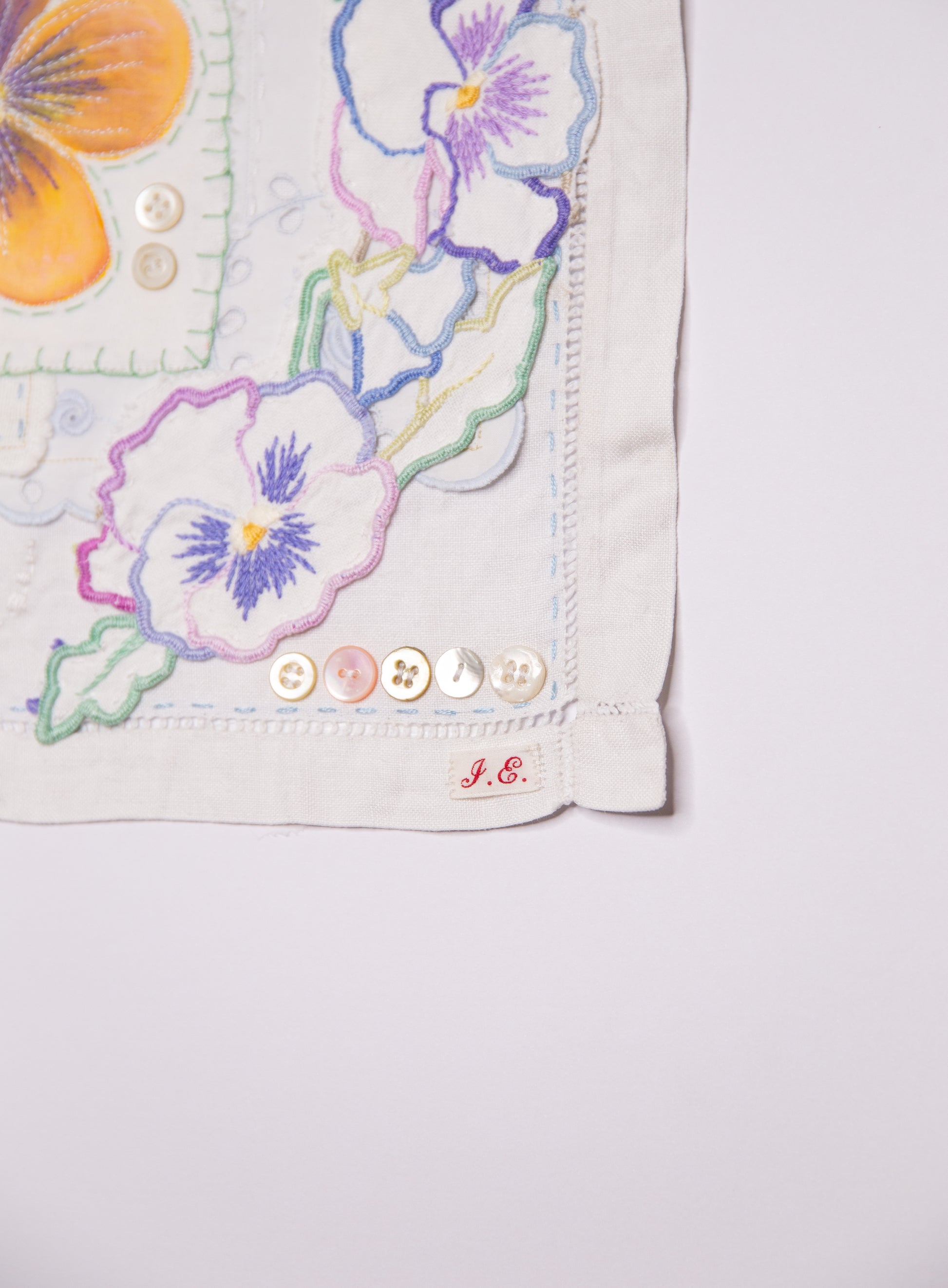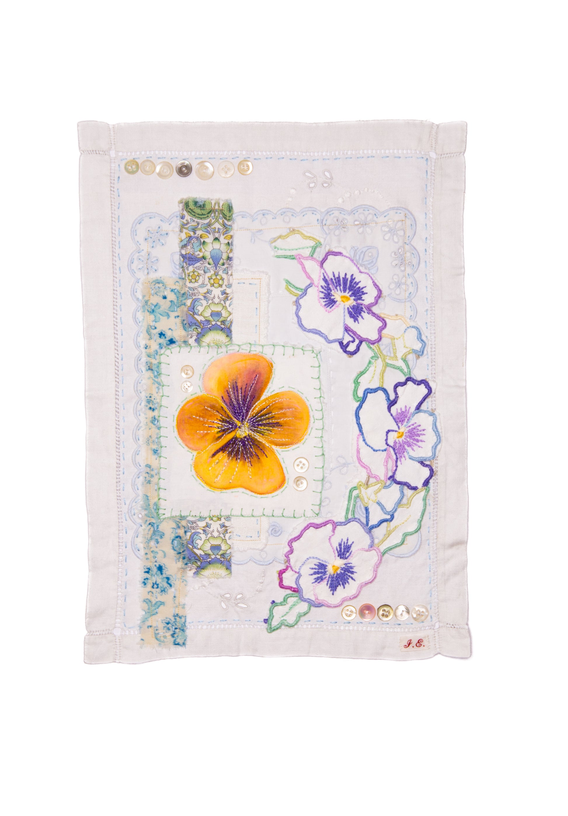 This piece combines modern and traditional textile techniques to evoke the delicate beauty of floral motifs inspired by antique china. Layers of painted fabric, intricate stitching, and appliqué create a richly textured surface